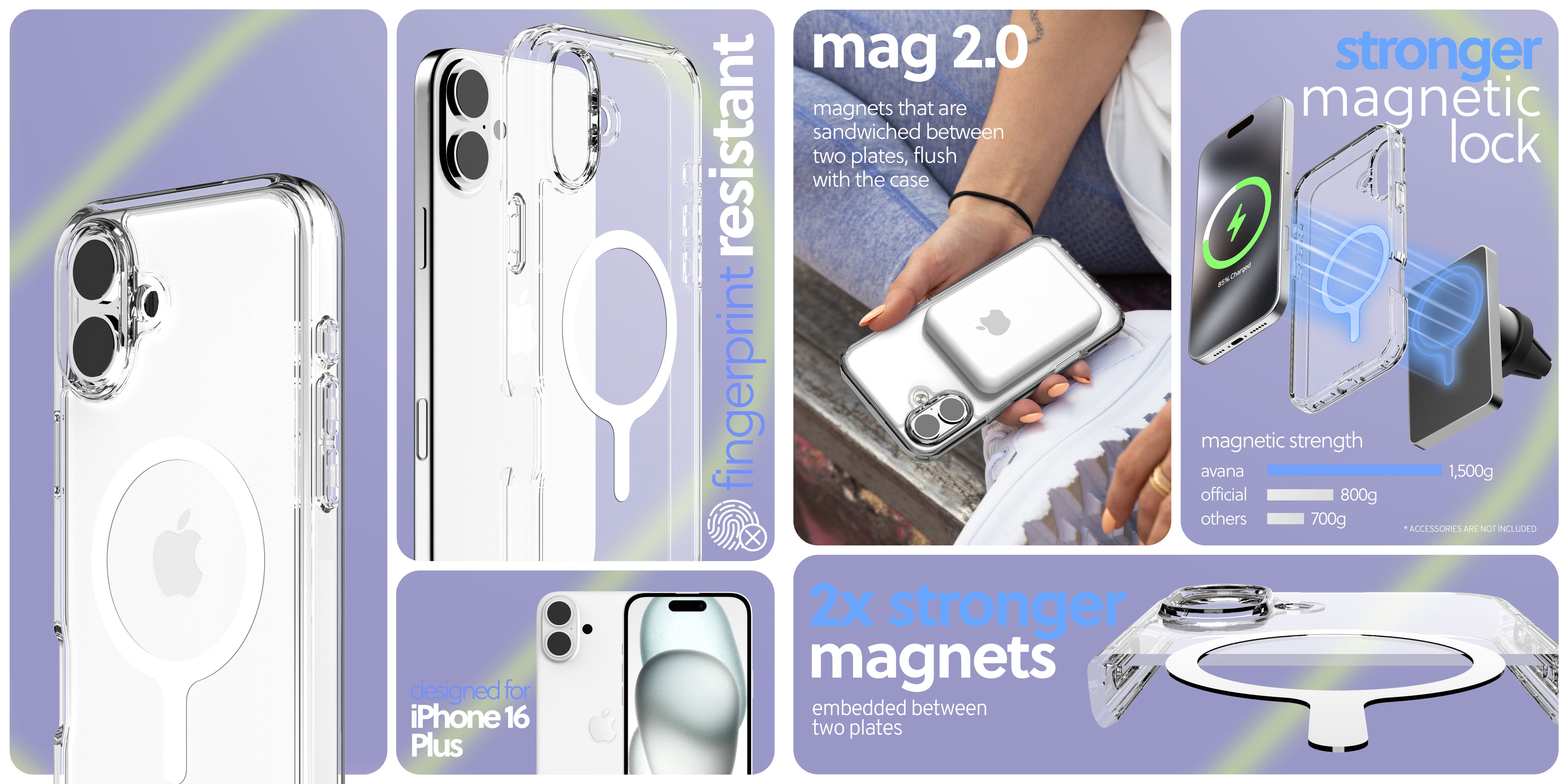 transparent shield with subtle edge. self-healing finish, 10ft drop protection, 100% recycled materials, extra-strong MagSafe, strap slot. quiet strength in every detail.